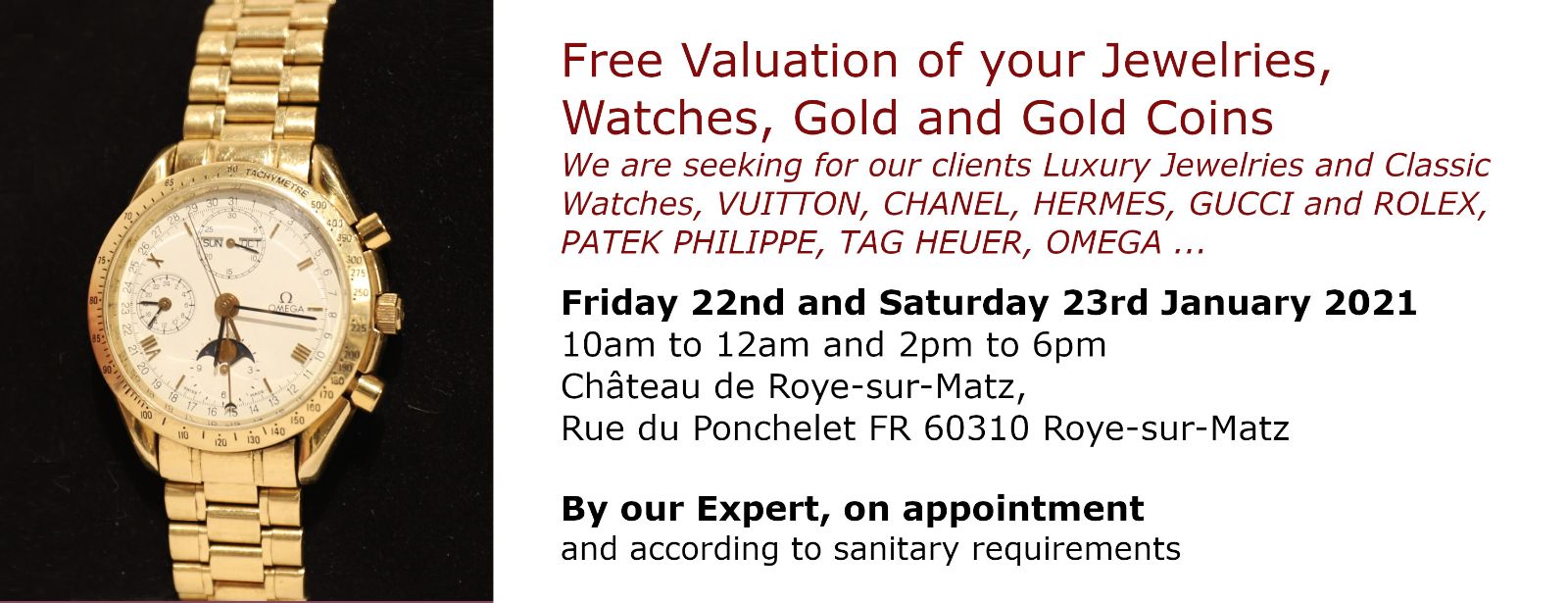 Luxury Auction at the Château de Roye-sur-Matz sunday, the 24th January 2021 at 10am and 2pm From 10am - Lots 1 to 173 : Jewelry and Precious Stones From 2pm - Lots 174 to 482 : Arts, Collectibles and Antique Furniture Exhibition at the Château From Thursday, 21st to Saturday, 23rd January, from 10am to 12am and from 2pm to 6pm Château de Roye-sur-Matz, Rue du Ponchelet 60310 Roye-sur-Matz Online Catalogue