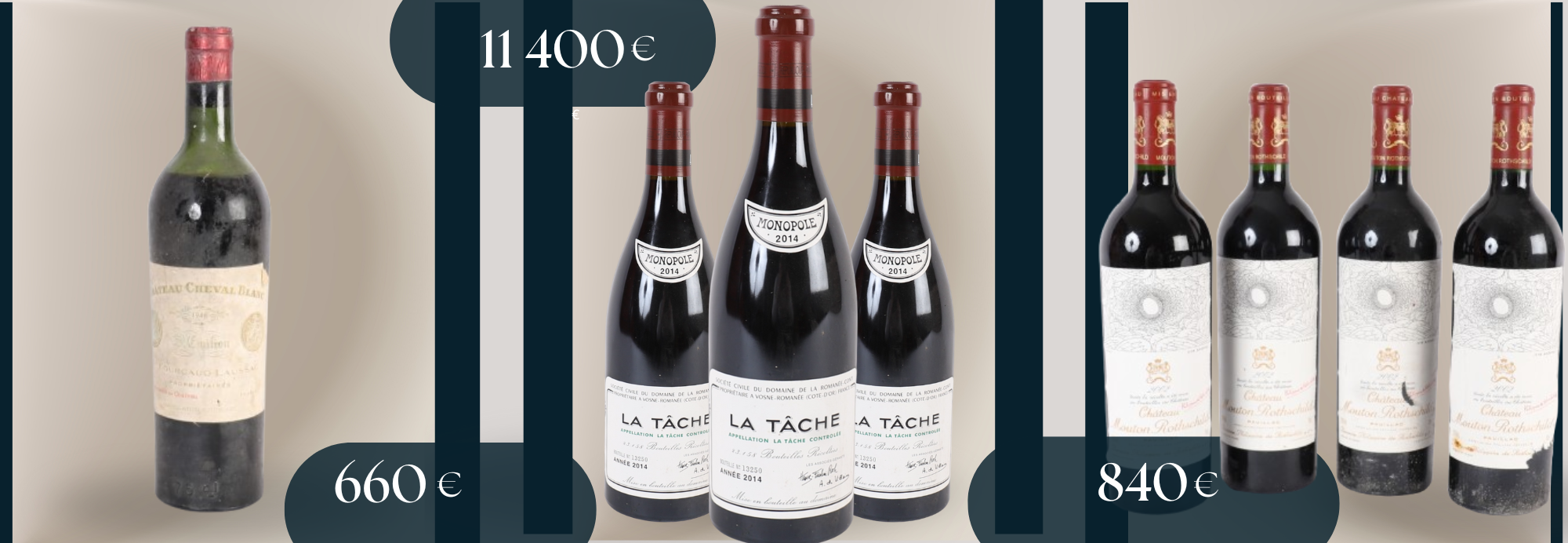 Des flacons des plus grands vins de Bordeaux y sont proposés, tels que les Grands Crus Château PETRUS Pomerol, Château Lafite Rothschild, Château Cheval Blanc, Château Mouton Rothschild, Château Ausone, Château Angelus, Château Coutet, Château Haut Brion mais aussi les vins blancs du Château d’Yquem.